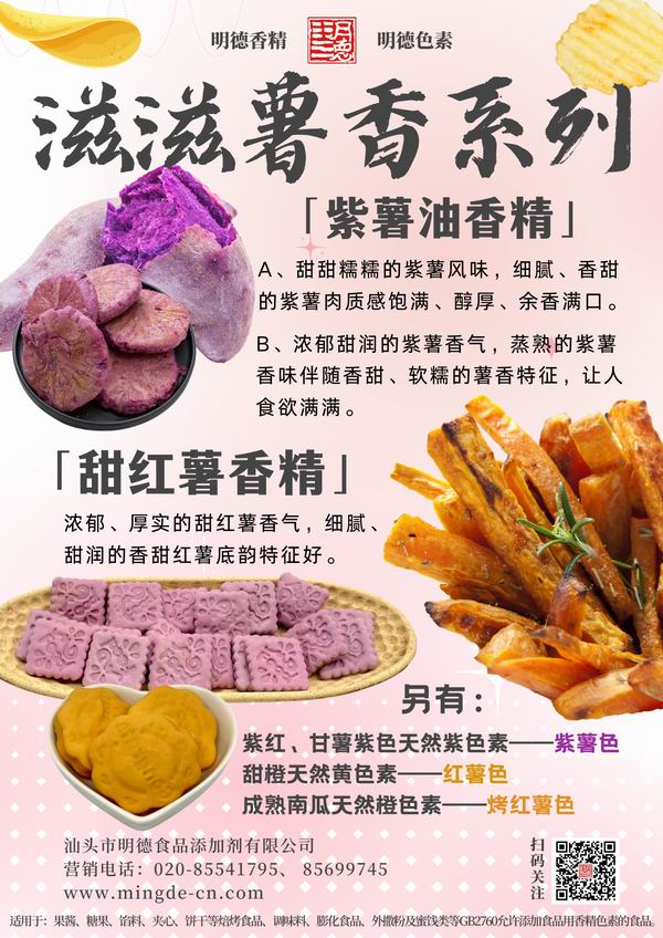 在薯味香精領(lǐng)域我們數(shù)十年潛心專(zhuān)研,迎合市場(chǎng)需求,滿足消費(fèi)者喜好,汕頭市明德食品添加劑有限公司,推出了多種風(fēng)味的番薯風(fēng)味香精,如:紫薯香精、紅薯香精、烤紫薯香精、烤紅薯香精、甜紅薯香精等。